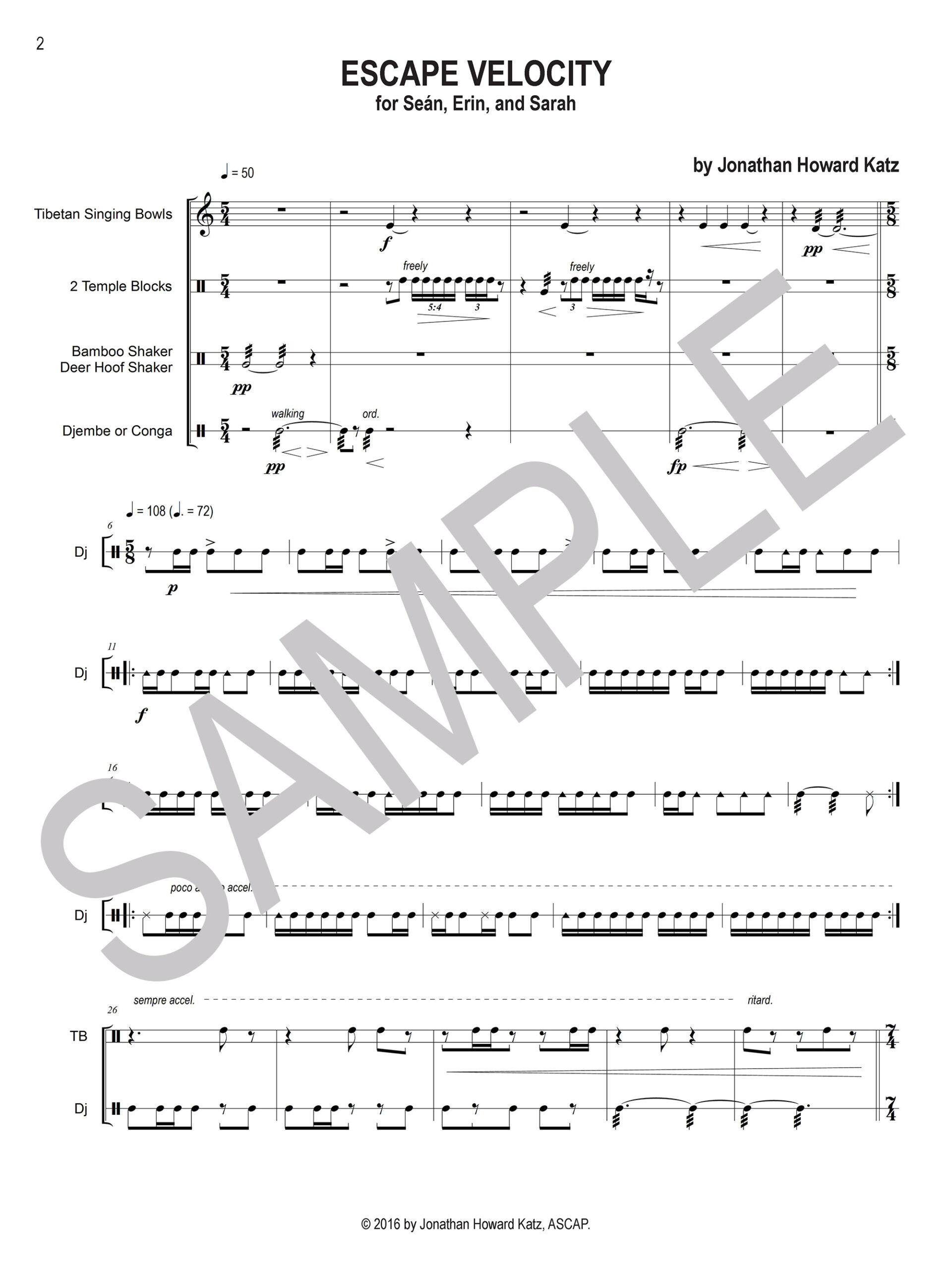Percussion setup: 2 Tibetan singing bowls tuned as close as possible to D and E, 2 temple blocks pitched around G (lower) and E (higher), two open shakers (preferably one made of bamboo and the other of deer hooves), djembe or conga