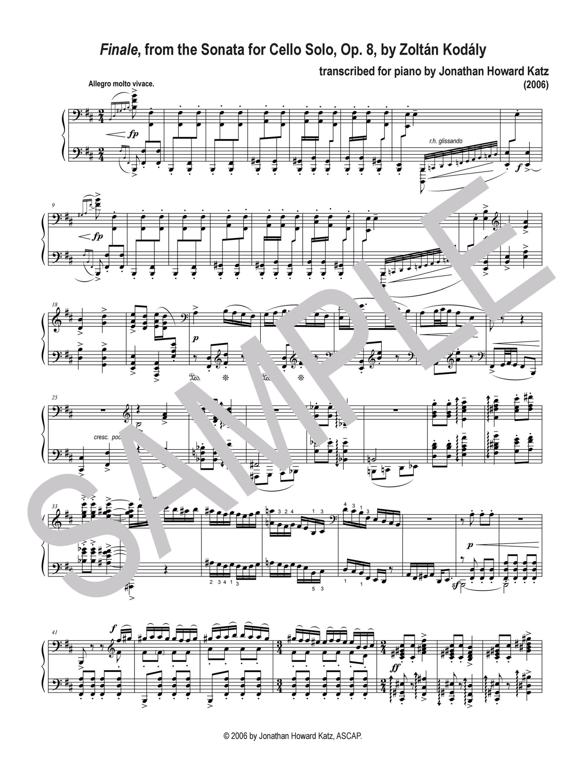 TRANSCRIPTION OF THE FINALE FROM KODÁLY’S SONATA FOR SOLO CELLO (2005-2006) by Jonathan Howard Katz